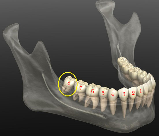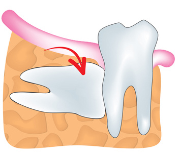 歯茎の中で完全に横に生えてしまうタイプです。この親知らずを水平埋伏智歯と言います。