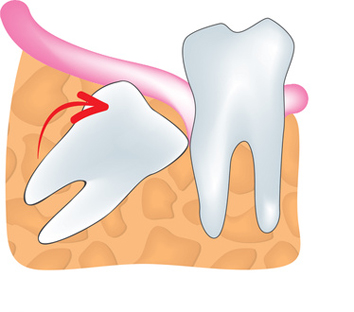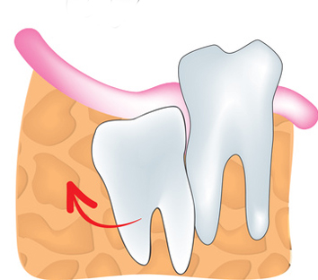 親知らずが斜めに生えて隣の歯にぶつかって圧迫してしまうタイプです。このタイプが最も多いです。